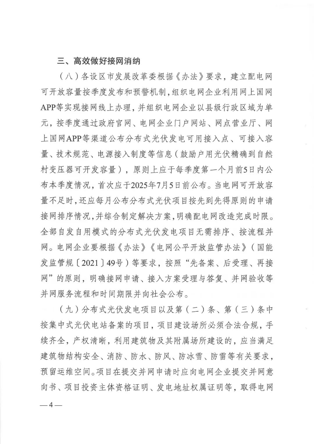 •为保障项目顺利落地,新政要求各设区市应建立配电网可开放容量发布和预警机制,通过线上办理接网、季度公布接入点信息等方式,提升透明度。电网企业遵循“先备案、后受理、再接网”原则,公开并网服务流程与时限,让企业办事更省心、更高效。