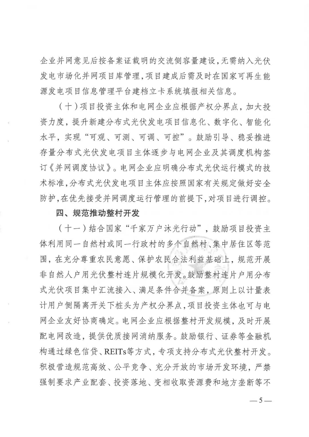 •结合“千家万户沐光行动”,新政鼓励在尊重农民意愿、保护农民利益基础上,开展非自然人户用光伏整村连片开发,支持集中汇流接入、合并备案。电网企业同步推进配电网改造,金融机构可通过绿色信贷、REITs等方式提供专项支持,构建多方共赢格局。